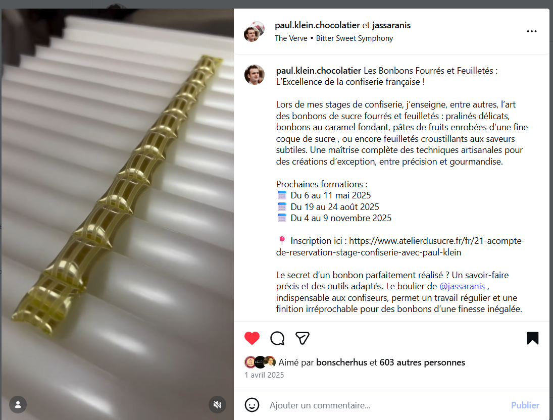 "Partenaire de mes formations confiserie, j'utilise les appareils Jassaranis pour les bonbons fourrés, feuilletés, berlingots et calissons!